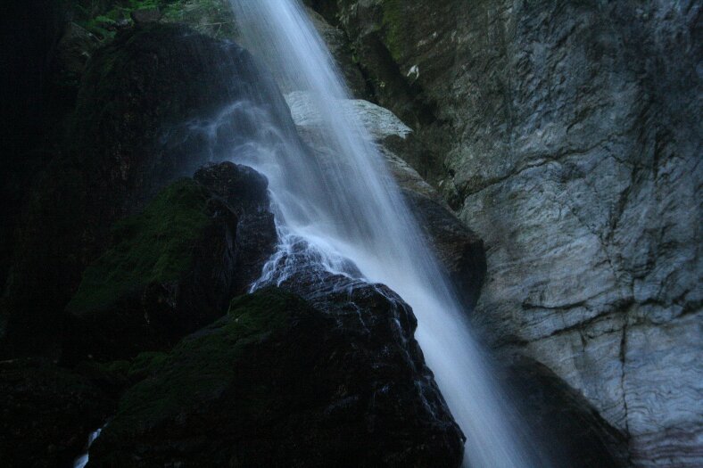 岩に挟まれた暗い滝は手撮りがむつかしいが