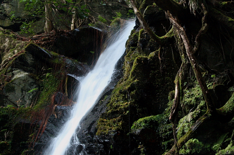 ひぐらしの滝 2009/02/12 京都府京都市右京区嵯峨清滝月ノ輪町 落差:10m たっぷり2時間半近く滝見を楽しんだ後下山体勢に入る。 来た道を引返すのも脳がない。 左岸の踏み跡を10m程登ると細い急傾斜の作業道に出た。 どんどん下ると200mも行かない内に前回の撤退場所に出た。 諦めるの早すぎたようだと悔やんでみても「後で気がつく寝小便」だ。 この時、突然携帯TELコール。 「あ〜浅山ですが〜今何処や〜?」 「前回の撤退場所」 「ちょっと用事があって清滝まで来てるんや。早う降りて来〜・・・xx△zz※ツ〜」 切れてしまった。 滝から前回進入した「水飲み場」のある分技(ベンチが有り第一ベンチの標示)までに要した時間は15分弱。 右岸から急傾斜を下るルートより「水飲み場」(第一ベンチ)から入るルートの方が断然容易で楽だと解った。 |