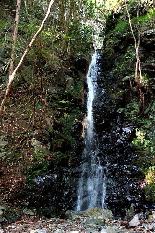 ひぐらしの滝 2009/11/06 京都府京都市右京区嵯峨清滝月ノ輪町 落差:10m 当日は快晴の天気予報だったが清滝トンネルを出た清滝バス停の8時40分では谷は濃い霧がたちこめていた。 「空也の滝」上流の右岸「大杉谷道」は前回の訪瀑で解っている(ベンチ1)に一汗かいて到着。 (ベンチ1)からは前回の訪瀑で解ったクリン草自生のわき路に水平歩行し沢に近づく平坦路。 やがて沢左岸に渡ってすぐに急登の作業道を登ると「ひぐらしの滝」が杉木立の沢に見えてくる。 バス停から約1時間の10時では虹のショウタイムは10分程前に終わっていた。 前回の2月中旬では10時半でも陽射しが滝壺に射しこんでいたのだが季節の移ろいはショウタイムを変えていたのだ。 滝壺左岸の陽射し円の証拠写真(10時33分)は2月中旬では滝壺に射しこむ状態だったのだ。 |