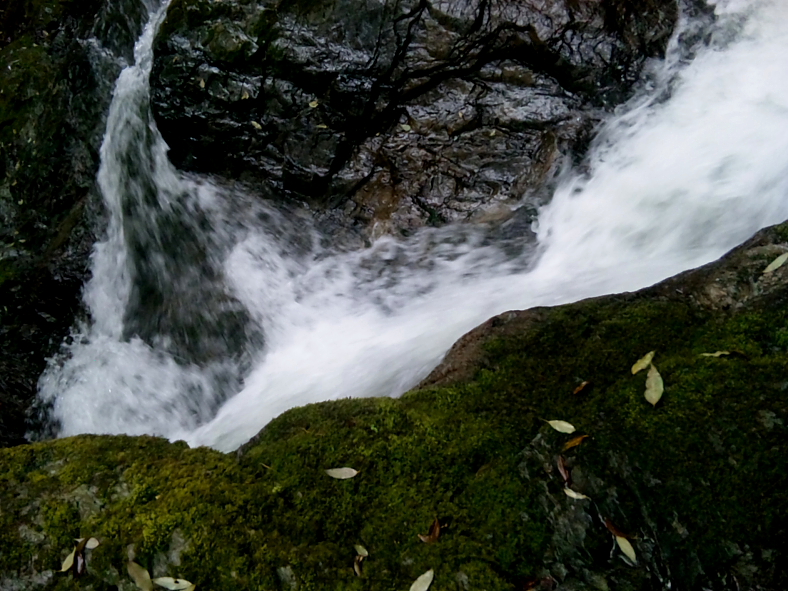 「弁天の滝」はこの曲った小滝の落ちる橋を渡った林道を登ってすぐに見えてくる。