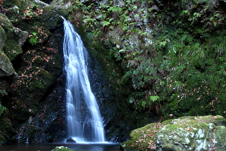 毘沙門の滝 2010/01/18 京都市右京区梅ケ畑川東 清滝川左岸毘沙門谷 落差:下流から橋下3m滝、6m2段滝、しばらくはゴーロが続き、5m滝、二段15m滝、6m滝、毘沙門の滝:20m 暫く撮影に夢中になる。 ふと気づき・・上流にはどんなにして行こうか? 左右を見渡せど急斜面の谷底。 左岸は絶壁だが右岸なら木の根を掴んで何とかなるかも? でも登った先がどんな状態かもわからない・・ 滑落したら助からない・・かも・とマイナーな発想ばかり浮かぶ。 でも谷を引き返すのは絶対嫌だ。 やるしかないか〜と気合を入れて右岸を登り始めて、ふと見ると虎ロープが風に揺られてプ〜らプ〜らしてる。 虎ロープの上を眼で追うと延々と上に続いている。 (助かった〜)と思う反面(このロープ信用できるか〜?)。 |