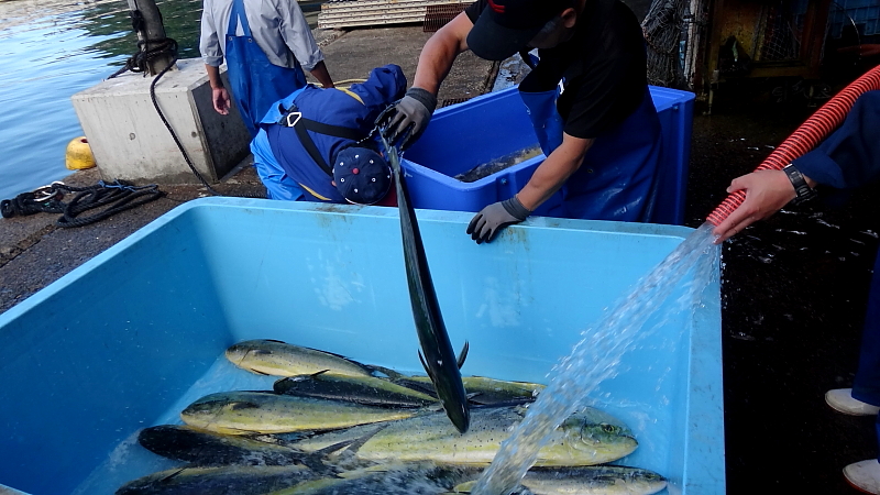 舟屋の宿 2016/08/20~21 その脇で男衆が「シイラ」の冷水洗い こちらは当日の水揚げでは最大魚の様子 これはまだ小ぶりだが成魚は最大で体長2m・体重40kg近くに達する。 何でも食いついてくる獰猛な魚のようだ。 呼び名は地方によって違うとかドキッとするのは、 シビトクライ(死人食らい、千葉)だ。 ハワイではマヒマヒと呼ばれ高級魚として扱われるが日本は他国に比べて味の評価が低いという。 日本の陸揚げ漁港 第1位 - 気仙沼漁港(宮城県) 第2位 - 浦分漁港(高知県) 第3位 - 川南漁港(宮崎県) ーーーーーーーーーーーーーーーーーーーーーーーーーーーーー さあ 気温の上がらない内に今日の一番滝の 「九の滝」:網野町切畑 を目指して出発!! |