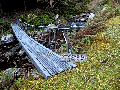 美山町最北に近い「不動の滝」は、きつ〜いジグザグ急登に堪え谷底に滝らしい水流の見えるトラバース路を行った先の橋渡った先に落ちていた。