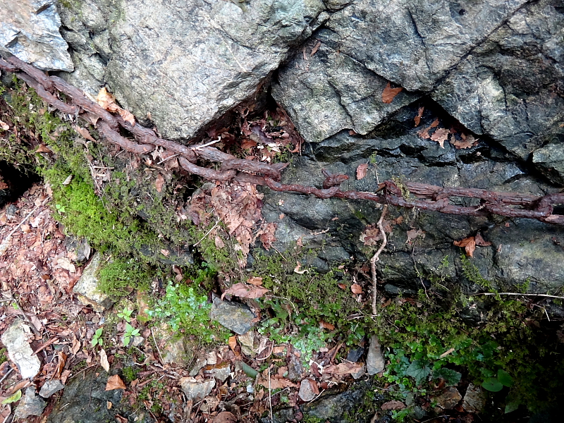 「七色の木」を越えたあたりから登山道は険しくなり、岩に打ち付けてある鎖が長い年月で老化した危険な鎖が方々にある。