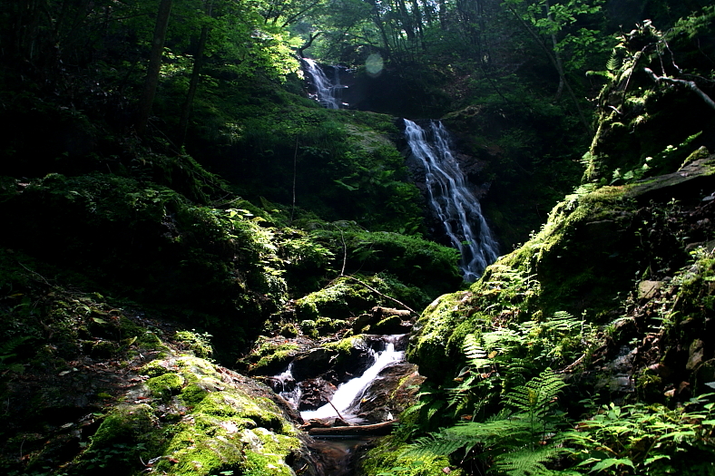 二段の斜瀑の下流に更に緩い傾斜の滑が続き新緑と苔の緑に癒される。