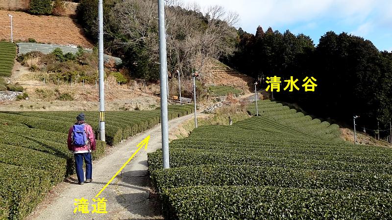 ガイド板を右折して清水谷方向に茶畑の中の舗装路を歩くと徐々に傾斜が上がってくる。