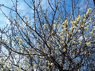駅のホーム脇の梅の花がにこにこと笑っていた。
