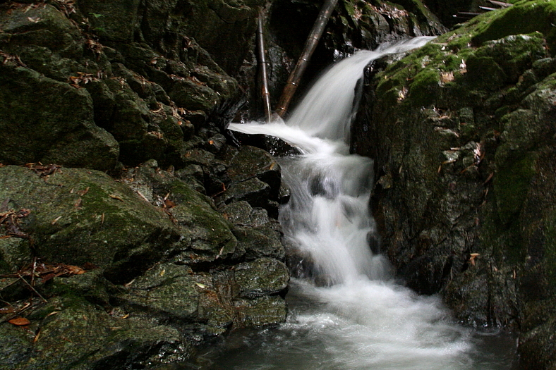 車谷の滝群 2015/06/06 京都府木津川市山城町綺田車谷 天神川 落差:F1:1m、F2:1.5m双瀑、F3:4m、F4:3m、F5:10m長滑滝、F6:7m、2段 滝の向き=西 竹藪は簡単に抜けられたが「F4」は高い右岸の岩場の下で全景が見えない。 「F4」の下の様子は更に見えないが対岸の下は比較的平坦な岩場だ。 こちら右岸の岩場を降りてそこに渡れても「F4」下から上流に上がるには背丈以上の岩の段差を乗り越えなければならないのだ。 京の滝紀行の(峰さん)に持参ロープを渡し取り敢えず対岸の下に降りてみることにした。 岩の段差乗り越えができなければ再度お助けロープで右岸に還ってくる作戦。 上を見ると頼りない錆びた二番目の橋が渡っているので、最悪その橋を渡って林道に出て上流側の左岸から「F4」上に降りて撮る作戦だ。 対岸下には比較的容易に降りられF3から13分経っていた。 この「F4」は落差はないが中々の味のある流れの滝だった。 下流は滑状に両岸の岩の間を「F3」に向かって流れていた。 水量が今回以上にあれば降り立つことは危険と思われる。 背丈以上の岩の段差乗り越えは、岩に垂れ下がっていた放置網がロープ代用になって助かった。 京の滝紀行の(峰さん)は、吾輩の行動を見届け橋までの斜面を急登して橋を渡って上流側の左岸から「F4」上に降りて合流。 あの橋を渡るのは、心臓バクバクものだったに違いない。 こういう場面では相棒の存在が不可欠だと思った。 |