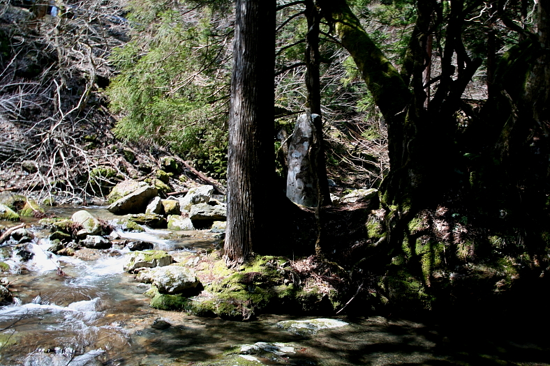 「明神滝」の流身全体が見え難いため上流から対岸に渡渉すると杉の木の傍に2m高程の”奇妙な石”が立っている。