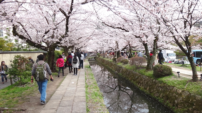 銀閣寺前の疎水沿いには外国人の桜花見観光客の喧騒。