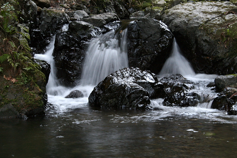 三筋滝 2009/04/09 京都市山科区小山長尾 音羽川 落差:1m 「蛇壷」の少し上流に「大蛇塚」という塚が祀ってあり5分程で横石橋に着く。 「仙人の滝」の落ちる支流に分かれる場所だ。 午後3時の音羽山の山上は雲一つない青空が抜けて桜も満開だが今日はここまでとしよう。 しかし、この時間の国道はまだジリジリする暑さだろう。 フェラーリで下って行けばこの渓谷は5分で国道にでてしまう。 ゆっくり渓谷を横目でウオッチしながら下ってゆくと「経岩」の少し下流に「小さな滝」と大きな「淵」が目についた。 流れに降りてみると遊歩道からは二筋の滝が三筋になっていた。 何故こんな小さな滝にこの大きな美しい「淵」。 「三筋滝」とした。 |