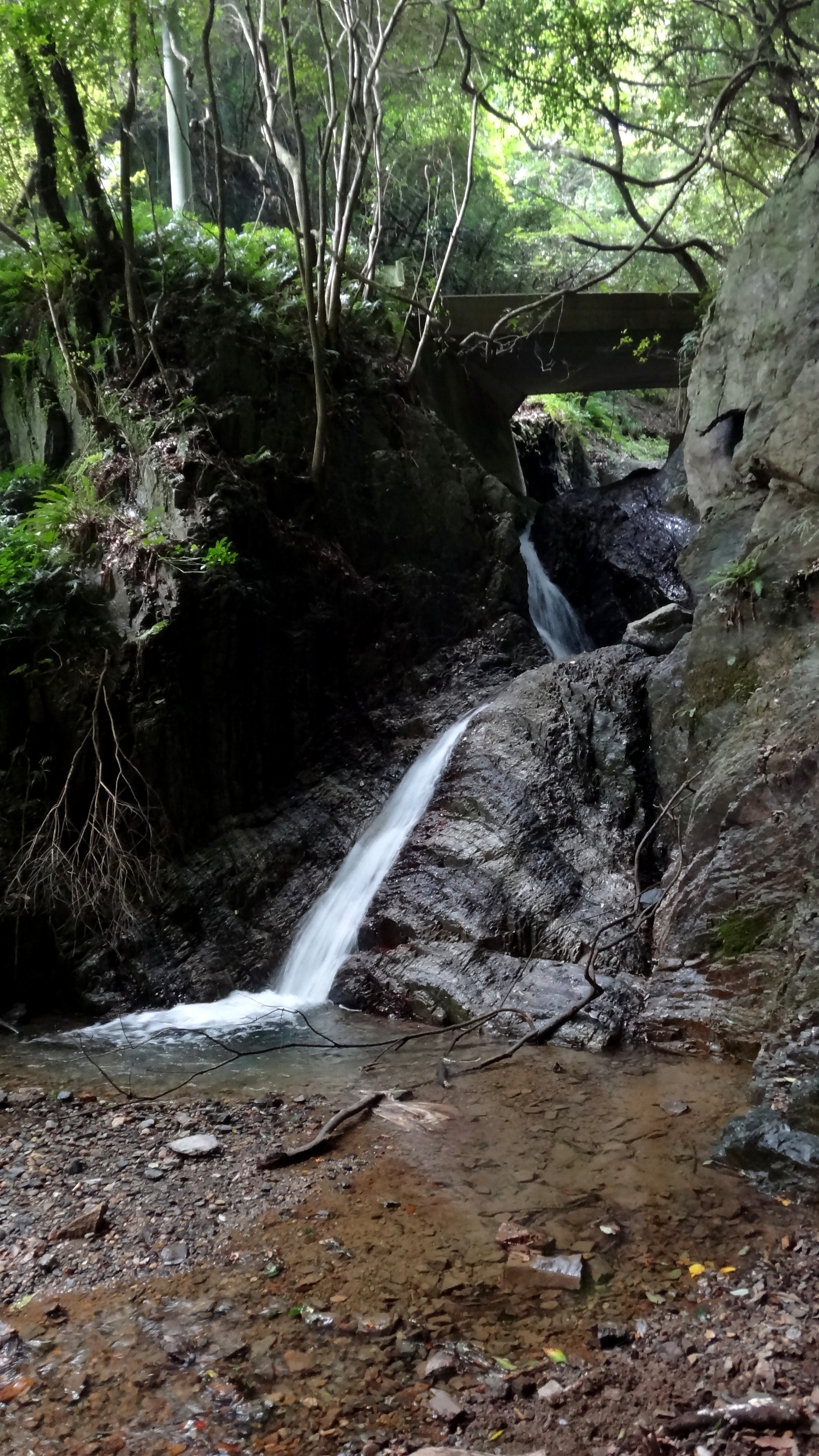 落差:上段2m小滝、中段4m二連(直瀑+滑滝)、下段3m滑滝の9m三段滝