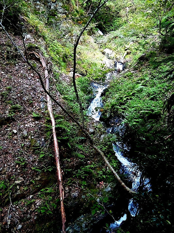 沢に出て上流に辿ると「やよいの滝」らしき斜段瀑が見えてくるが踏み跡は全くなく急な斜段瀑を見上げても荒れた倒木や雑草が目立つだけだ。