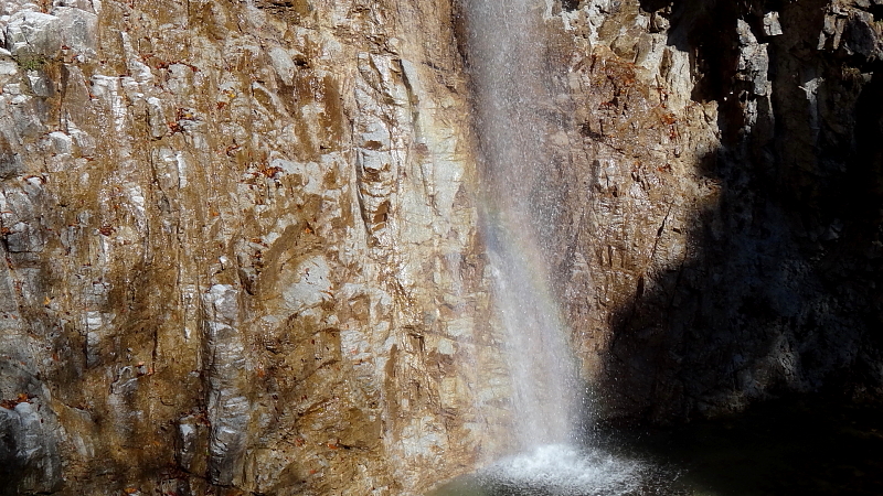 この滝の岩の茶色に虹が映えないことに加え当日水量が虹の素になる飛沫が飛ぶには少なかったようで目立つ虹が見られなかった。