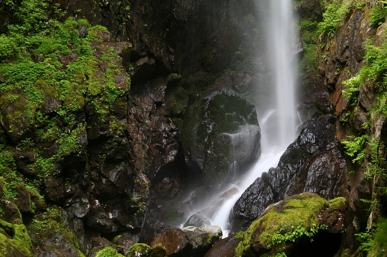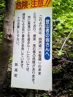 高滝 2009/05/04 三重県松阪市飯高町蓮 宮の谷 落差:蛇滝5m、風折の滝70m、高滝50m 滝の向き=蛇滝:(宮の谷)北、風折滝(水越谷):北、高滝:(宮の谷)東 ![]() 地図をみると上流にまだ滝があるようだが・・ こんな恐ろしげな注意表示が建っている。 充分楽しんだので大満足るんるん気分で下山して登山口2時45分帰還。 全6時間35分の周遊でした。 このあと「道の駅・飯高駅」に戻り温泉風呂に入った老人徘徊者連は大酒盛りを繰り広げたのでした。 またまたこのあたりの詳報は写録の旅人さんの”大満足の徘徊 後篇”をご覧ください。 また最後になりましたがご案内下さった”豊場さん”大変ありがとうございました。 われわれのために重たい装備を携行してきてくださり適切なサポート感謝します。 今後ともよろしくお願いいたします。 大変ありがとうございました。m(__)m |
