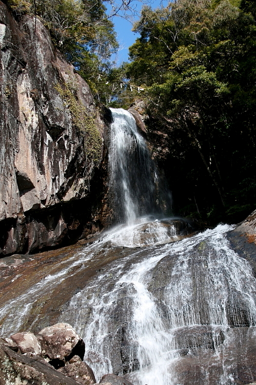 神社参道を歩数分で本殿右手裏に独特の形の「大馬清滝」が見えている。