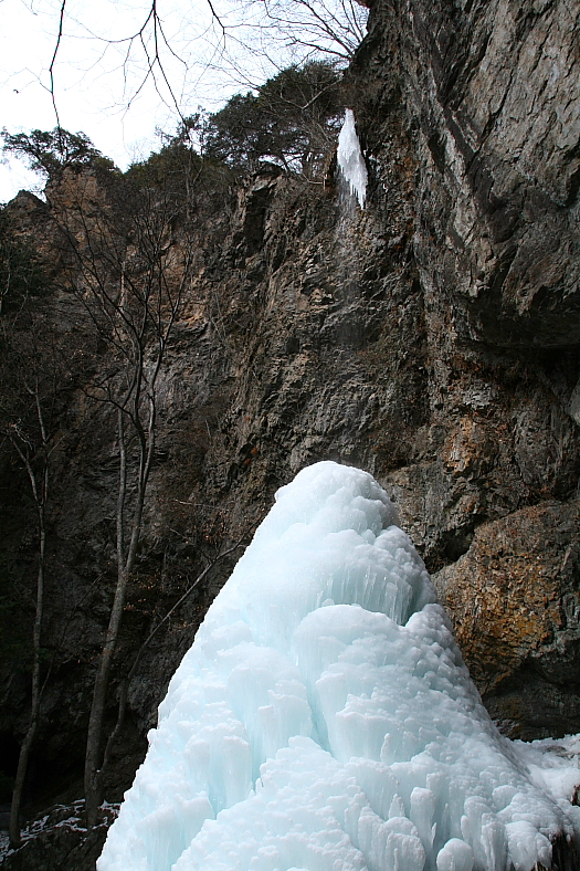 「大禅の滝」 2008/01/20 長野県北相木村下新井 千曲川水系 相木川支流 深沢川 10:43〜11:21 案内の写録の旅人さんが「氷瀑として欠く事が出来ない」という三滝。 立派に整備された参道の急階段を10分ほど登ると異様というか威容というかは見る人の感性によるとして案内板には「マツカサ」と説明されている結氷が見えてくる。 私には何ともユーモラスな盛り飯に見えた。 この滝を開山した禅宗の「大禅僧都(そうず)」は滝マニアの元祖と言えなくも無いなどと勝手に決めつける。 滝の落ち口と盛り飯の間はやがてつながるのだそうだが霧降状態に落ちる水が静寂の中で微かに冷え冷えとした音を発している。 |