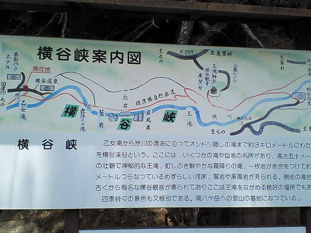 「乙女の滝」表示で横谷渓谷遊歩道に入りその後渓谷上流を目指すと霧降の滝>屏風岩>王滝(2Km程?)の順の緩い登り道(標高差400m 程)だ。