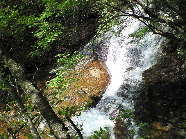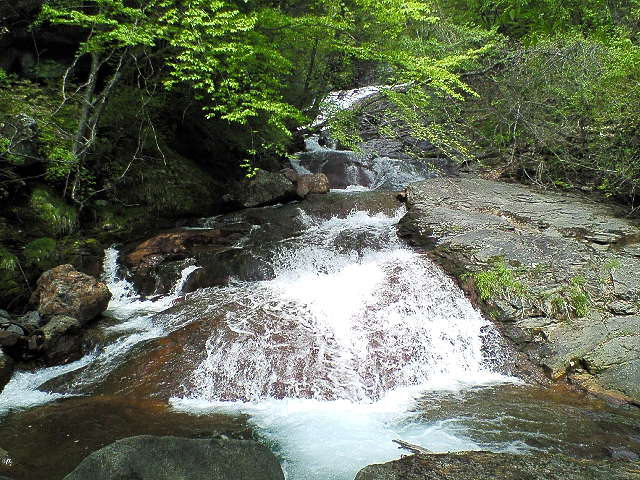 遊歩道を更に辿る上流は渓流透明度があがり無名の滑が連らなるのが木の葉隠れに見えて傾斜があがってくる。