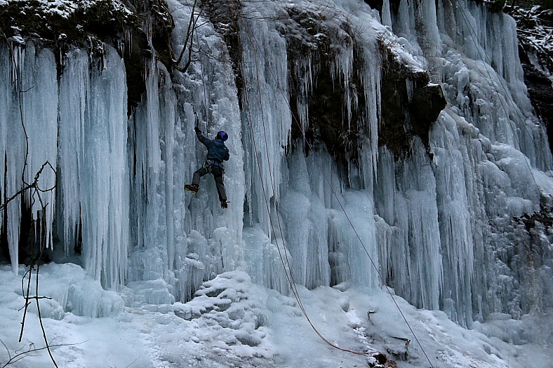 湯川の氷瀑氷柱群 2008/01/20 長野県南牧村海尻 14:27〜15:03 更に奥の枝沢には成長の著しい氷柱がみえるので渡ってみることにした。 対岸に渡るには写録の旅人さんはスパイク付長靴なので全く問題ないが、スパイクシューズの二人は慎重にポイントを選び対岸へ。 スパイクシューズは大正解の装備だった。 対岸の氷柱では若いグループがアイスクライミングに夢中だ。 ピッケルの曲がったような鎌のようなツールを左右の手に持ち氷柱に交互に打ち込みながらアイゼンのついた両足で氷柱を登っている。 時々氷柱が折れた拍子に数メートル落下してヒヤリとさせられるが命綱で胴の宙吊りに耐える。 よく見ると最上部に2〜3名の命綱補助メンバーがいる。 命綱補助メンバーは最初に登ったのだから命綱がない状態で登ったことになる。 沢登りや滝登りにも似たような人がいるが、何かが彼等をかきたてるのだろう? |
