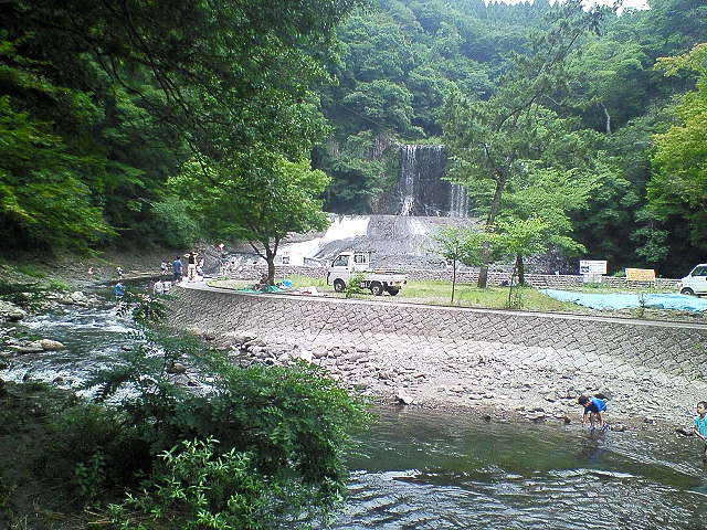 滝手前の両脇は川下から見て左が「竜門の滝キャンプ場」で右側が「上杉キャンプ場」。