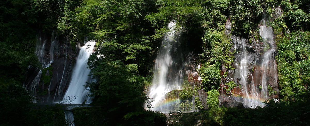 最奥「白水の滝」まで15分位の「母滝」の階段を登った先に虹のカーテンが見える。