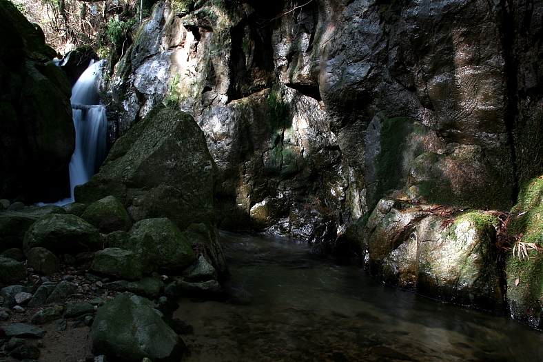 不動の瀧 2010/03/12 滋賀県湖南市三雲 野洲川支流荒川支流 落差:6m 2段 滝の向き=北 「小春日の滝徘徊6・毘沙門の滝」以来の1週間は雨天、曇天の寒のぶり返しから、やっと当日晴天が戻ってきた。 このチャンスは冬季の滝徘徊には、水量が期待できる願ってもない廻り合わせだ。 考えてみれば「小春日の滝徘徊シリーズ」が7回にも及んだ原因は、この冬の雨天が周期的に廻ってきたからでもある。 当日、JR草津線「三雲駅」に8時半ころ降りたち、駅裏の緩い勾配の道路を「県道4号線」に向かい歩きはじめる。 10分程で「県道三雲交差点」に到着し、ここから県道r53でマセボ峠方向に南下し「不動の瀧」到着が「三雲駅」から25分程経過の8時55分。 赤や黄の旗が建つ不動瀧お決まりの滝前に、個人的趣向の文句を言っても始まらない。 左岸の岩壁の不動さんの彫り物はなかなかの出来栄えだ。 |