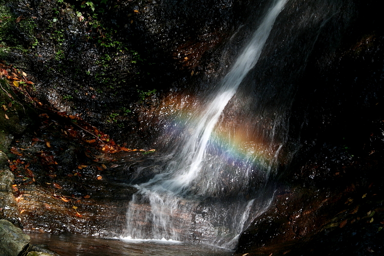 ラッキーなことに滝に着いた時、「子母婆の滝」左岸から見ると虹が懸かりはじめた。