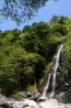 鳴野橋左岸道を進み藤切川の河原を上流に辿るとやがて膝深さ程の淵や岩場越え、斜岸越え等の結構な難路(800m程)を30分程遡上すると藤切川右岸支流(またに谷)の林道橋下から落ちる「布引の滝」に着く。