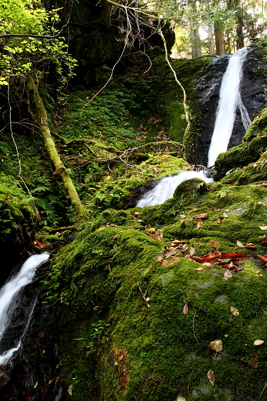 北向きの滝の宿命で青空は望めないが緑はこの季節でも鮮やかだ。