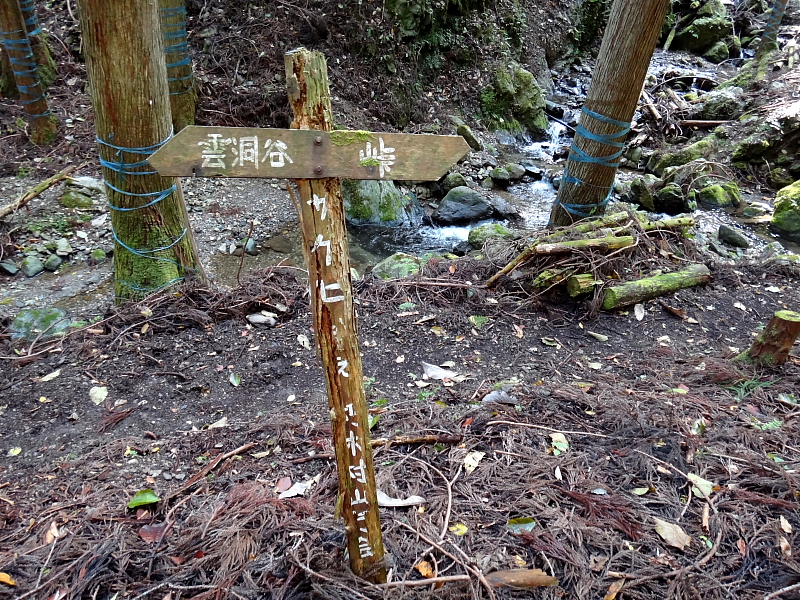 布の滝 2012/10/30 滋賀県高島市朽木雲洞谷(くとうだに) 北川支流/サケビ谷 落差:8m 3段 滝の向き=北 しばらく支流右岸の路が続いた右手に”大きな岩”が出てきた。(10:13 23分経過) その後支流を何度か渡り返す内にこの”<雲洞谷 峠>”の標示とボロボロに腐った”布の滝”文字がこの標示柱の裏側(川側)に読みとれ、ここが”サケビ峠谷”の左俣分伎と解った。(10:19 29分経過) 裏読みするとこの標示柱は”サケビ越え”登山用で”布の滝”は、おまけ情報なのだ。 標示柱は、よくよく全方向から眺めろという教訓の見本のようだと勝手に思ったのでした。 |