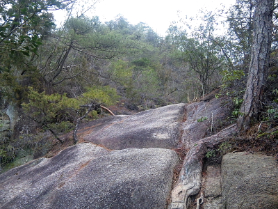 この岩路の左側の小さな松の木の傍に「お松の滝」が落ちる。