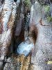 「落ケ滝」の下流350mの虎ロープ設置岩(松の根ステップ)の左に■「お松の滝」が落ちる。
