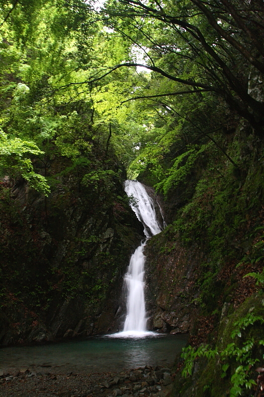 暗い滝前は、陰気だが新緑は雨で綺麗だ。