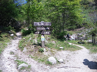 当日快晴の正面谷比良川の水量は先日来の雨もあって申し分なし。歩き始めて15分”大山口”の分伎(左写真)は左側”青ガレ・金糞峠”方向に進む。 右側橋を渡ると「神爾の滝」上流の北比良峠方向だ。 イン谷口から約300m標高差の「隠れ滝」(40分程)は、大堰堤3箇所ほどで急に傾斜が上がってくる。 |