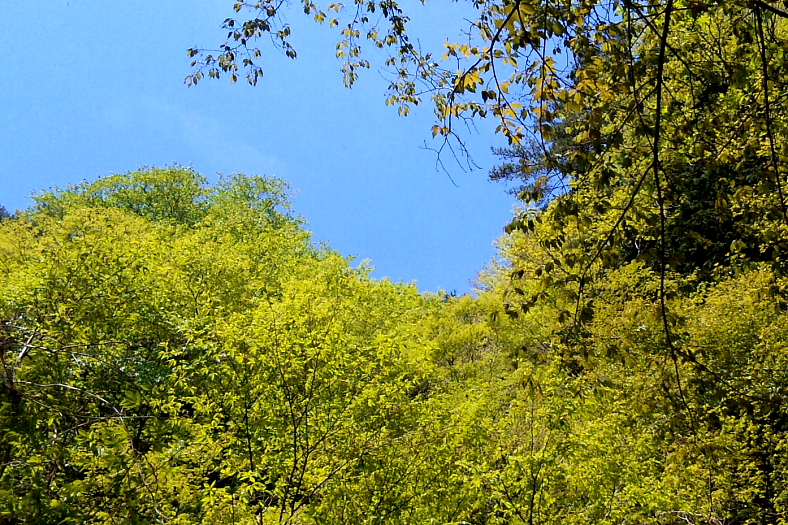 上空を見上げると”金糞峠”方向の新緑が目にしみた。
