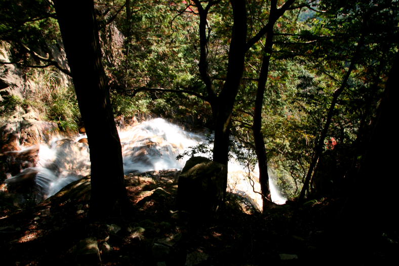 楊梅の滝 2008/11/05 滋賀県大津市北小松 落差:雄滝40m、雌滝15m、薬研の滝21m。 11時半過ぎ滝壺を後にして雄滝の遠望滝見台を目指す。 登り坂途中で、ふと右手の傾斜を見て(雄滝”滝頭”への路)が脳裏を過ぎった。 (この斜面の何処かに雄滝”滝頭”へのトラバース路があるに違いない)・・・と。 斜面を這い上がってみよう! 落ち葉と倒木のズルズル斜面は「御来光の滝」の面河渓の斜面のように固まっていないが40度はある。 必死に滑落に耐え赤いテープを発見した時(やった!)と内心叫んだ。 その後テープを注意深く探し雄滝傍の獅子岩方向と思われる方向を目指した。 そして獅子岩の下にたどりつき滝の流れ音方向に進むとこの画像の”滝頭”場所に出た。 雄滝滝壺から約30分だった。 |