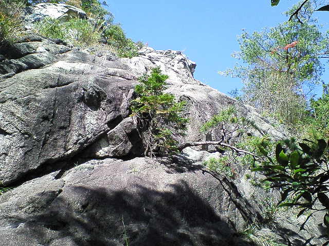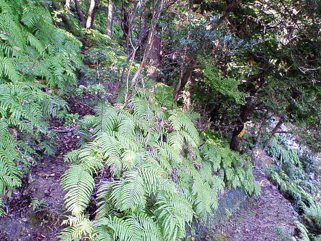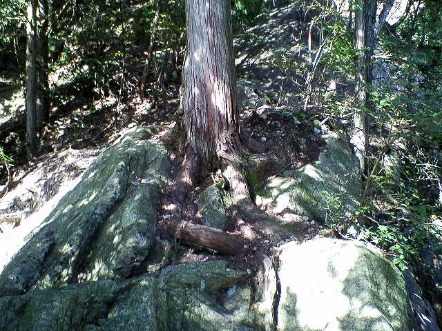 ”滝頭トラバース路”は最初はシダのような雑草の中をすすみますがテープ(赤や黄)を注意して進みます。次第に雑木や岩の路になり10分くらいで岩の上の細木に赤テープが見える。