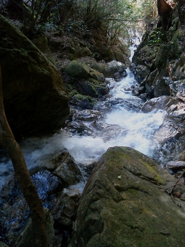 この画像は「沢登りコース」で登ってきた直後の8時42分メモ撮り「薬研の滝」俯瞰。