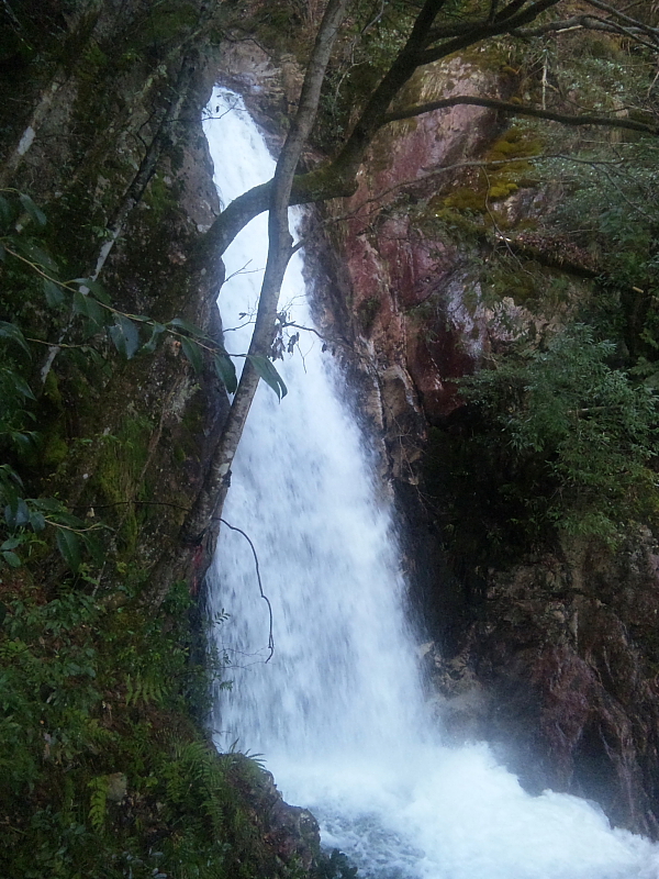 この雌滝”右岸景”と次の雌滝”上流”は、大水量で雌滝壷数m先の右岸に渡ることが出来ず引き返したP脇橋から始まる”下流尾根道コース(仮称)”から登り>展望台>「雄滝」>「薬研の滝」>「雌滝」右岸>展望台と辿り再びP脇橋に帰ってくる「薬研の滝」>「雌滝」右岸の中で撮った画像。