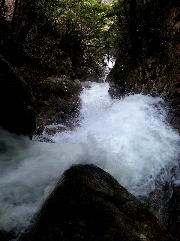 「雄滝」右岸下から俯瞰した「薬研の滝」も猛り狂っていた。