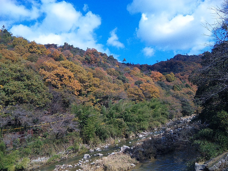 斧研の滝(よきとぎのたき)2009/11/25 滋賀県大津市上田上牧町 大戸川支流 斧研谷 落差:下の滝:3m、斧研の滝:8m、上の滝:13m、上流滑滝 12時ころ発電所前に帰還。 9時ころ入渓し3時間ものんびり遊んだことになる。 「下の滝」「斧研の滝」「上の滝」を見るだけなら1時間で往復できる。 発電所から見た南面の対岸は紅葉最盛期だった。 大戸川水量は写真では少なく見えるが発電所下流では発電済み放流と斧研谷渓流が合流する。 この大戸川上流1.5km程に次に訪れる「不動の滝」が落る。 対岸に見えているガードレールは県道r16。 |