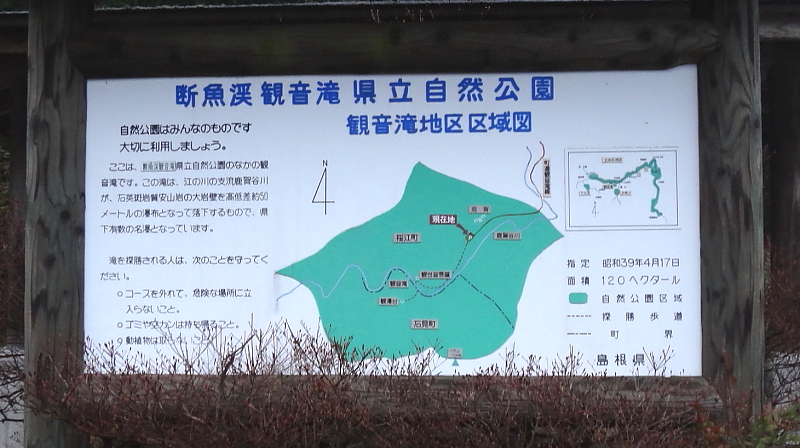 R261は江の川を渡った先は広島に続くがこの地方で有数の名瀑「観音滝」は、江の川を渡って直ぐをr295に右折してしばらくで駐車場・トイレに着く。6:25