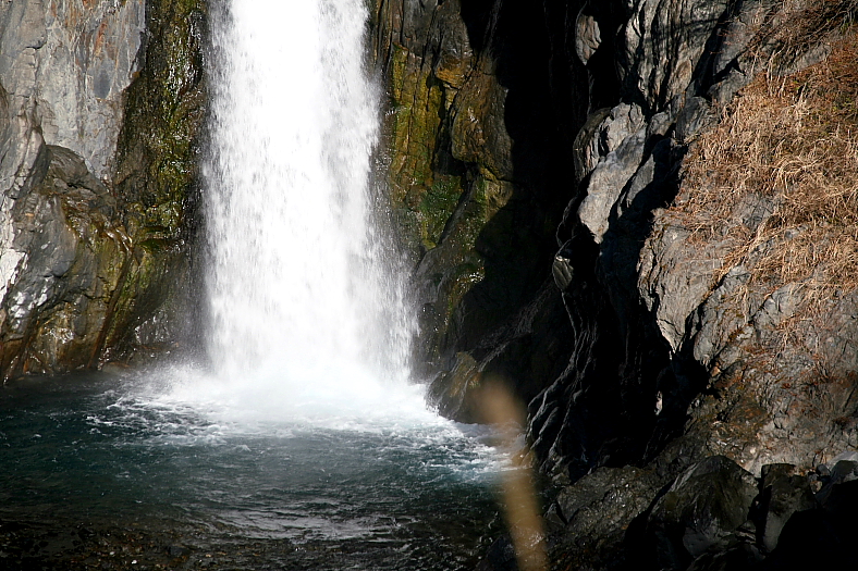 赤水の滝 2008/01/19 静岡県静岡市葵区梅ケ島字赤水 安倍川本流 落差:60m 「梅ヶ島七滝」のひとつ。 梅ケ島、コンヤ温泉の西の山伏岳の谷崩れで、安倍川がせき止められてできた滝。 崩落時の赤水が流れたことから名付けられたという宝永4年(1707年)大谷(おおや)崩れは、安倍川水源の大谷領が大地震に大崩壊し、長野県稗田山(ひえだやま)崩れ、富山県立山の鳶山(とびやま)崩れとともに、日本三大崩れの一つに数えられている。 南向きの滝なので虹が出るはずだが?・・・10時ころか?時間があわなかったようだ。 |