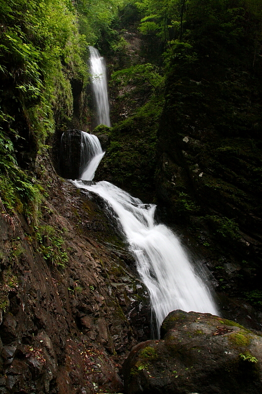 竜化の滝 2009/06/12 栃木県那須塩原市塩原 落差:60m 幅5m 滝の向き=南 塩原十名瀑の筆頭。 遊歩道入り口標示板の箒川上流側200m程に駐車場あり。 「抛雪の滝」「風挙の滝」上流に落ち国道400号から遊歩道15分程の支流最上流の滝。 日塩もみじラインを降り塩原温泉”湯の香ライン”の国道400号線を行くと"塩原バレーライン"といわれる国道域になる。 滝表示が数百mおきにでてくる。 「竜化の滝」は滝下に観瀑台が設けられているが観瀑台というより落石防御濠の趣き。 猛烈な飛沫が舞い落ちる暗い空間は異様な雰囲気だ。 |