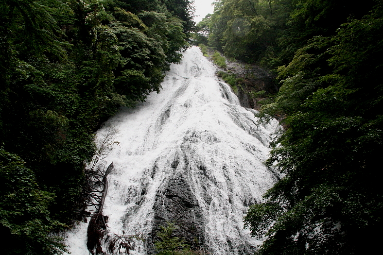 湯滝(ゆだき) 2013/07/29 栃木県日光市湯元 湯川 落差:50m、幅25m 滝の向き=南 「照葉峡の滝群」を終えみなかみ町から片品村に入りR401>R120へ左折。 金精峠トンネルを抜け奥日光に入ると霧に霞んだ湯の湖が眼下に見えて気温もぐんと下がってくる。 有料駐車場に駐車して滝正面の観瀑台まで歩きだした時刻が3時20分。 観光客はそれ程多くないが糸雨で暗く色が出ない上、滝の下に倒木と撮影意欲を削がれる。 しかし、滝の迫力は素晴らしく満足できたとして20分程で滝を後にした。 近々、観瀑台工事が始まり年度内は観瀑台が利用できないと土産物屋が話してくれた。 |