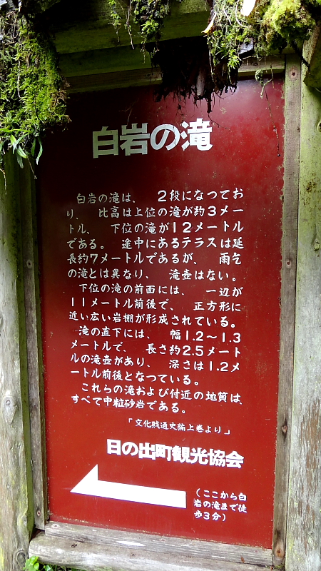 白岩の滝 2013/07/31 東京都西多摩郡日の出町大久野 平井川支流 タルクボ沢 落差:上流:白岩滝9+3=12m、下流:雨乞滝:8+6=14m(段間に雨乞淵を抱く) 滝の向き=上流:白岩滝/東、下流:雨乞滝/南 白岩滝、雨乞滝の総称を「白岩の滝」と呼ぶ。 県境の小沢峠のトンネルを抜け日の出町の「白岩の滝」を目指す。 東京都の最北部の田舎にやってきたのだ。 「白岩の滝」駐車エリアのこの滝案内板。 後で解ったのだが滝見客に評判のよくない案内板のようだ。 最下段に記載されている「文化財通史編上巻」などという史料は無く「日の出町史通史篇上巻」の間違いという。 史料がどうであれ日の出町の現在の広報では・・白岩滝、雨乞滝の総称を「白岩の滝」と呼ぶということだ。 |
