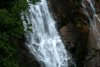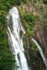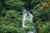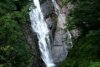 約25分で遊歩道の急階段(約300段)を登り暫く歩くと赤い吊橋に着き滝全景が見える。