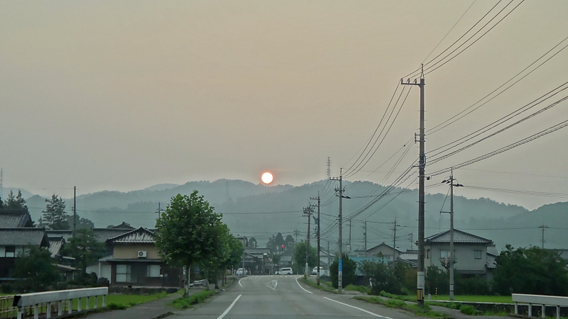 近くの道の駅”福光”に向かう6時半過ぎのR304の西空に綺麗な夕陽が見えた。