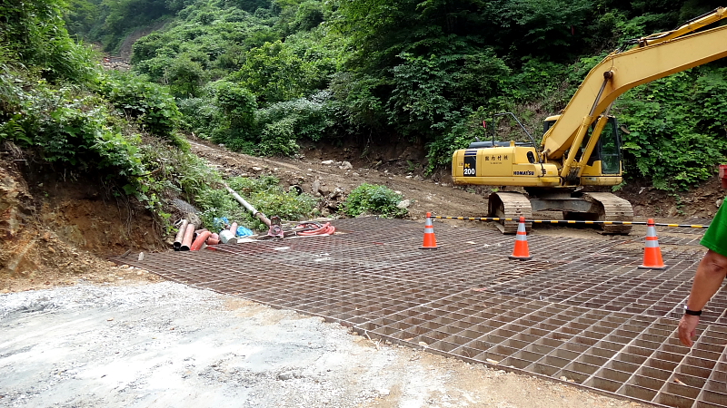 七重谷川沿い林道500m程から右側に回り込むと、隣の谷に回り込む道路の渓間工事中。